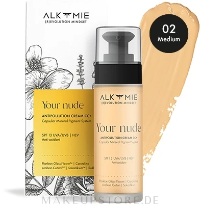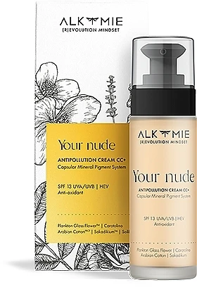 Mit der Alkemie Your Nude Antipollution Cream CC+ SPF 13 schlagen Sie bei der Pflege und beim Schutz Ihrer Haut gleich mehrere Fliegen mit einer Klappe. Die selbsttönende Creme, die in verschiedenen Nuancen verfügbar ist, passt sich Ihrem Hautton an und verleiht ihm dadurch einen ebenmäßigen Teint. Zugleich pflegt die Creme die Haut mit reichhaltiger Feuchtigkeit und bildet eine hervorragende Basis für Ihr Make-up. Nicht zuletzt wirken spezielle Inhaltsstoffe der Schädigung der Haut durch schädliche Umwelteinflüsse entgegen.