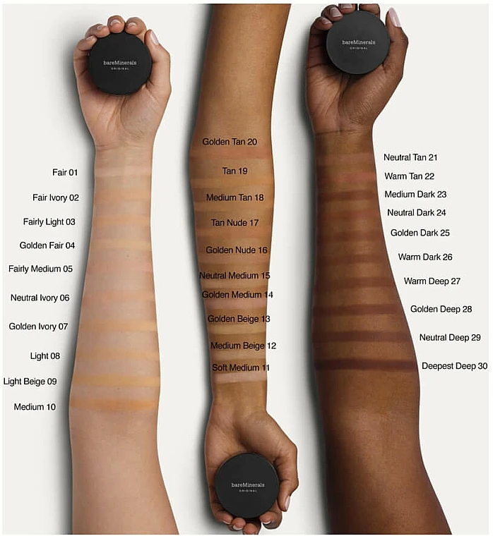 Bare Escentuals Bare Minerals Original Foundation SPF15 ist Amerikas meistverkaufter Puder, der die Haut zart und strahlend aussehen lässt. Die reine und einfache Formel besteht aus nur 5 mineralischen Inhaltsstoffen, darunter nicht-chemische mineralische Sonnenschutzmittel. Dies ist alles, was Ihre Haut braucht. Das Make-up hat eine ausgezeichnete Haltbarkeit und verstopft die Poren nicht. Nach dem Auftragen verwandeln sich die Mineralpigmente in eine seidige Creme, die nahtlos mit der Haut verschmilzt und sich nicht in feinen Linien und Fältchen absetzt. Das Ergebnis ist ein natürlich frisches und strahlendes Aussehen mit makelloser Deckkraft. Das Make-up-Produkt bietet außerdem Schutz vor schädlichen UVA/UVB-Strahlen. Der Puder ist frei von Parabenen, Silikonen und Phthalaten.