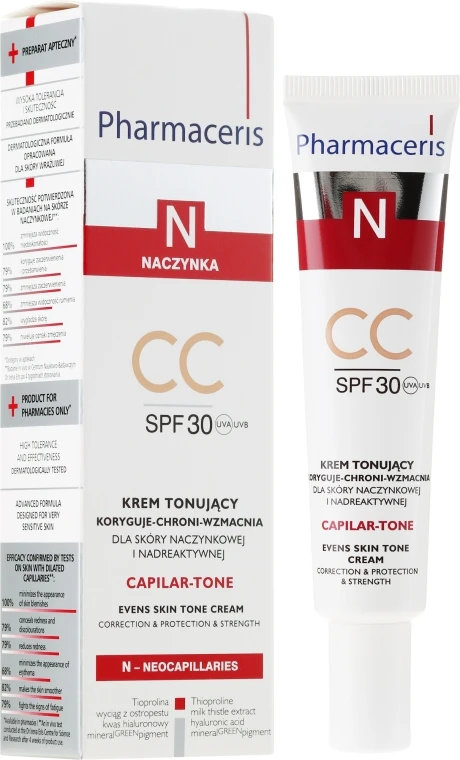 Die korrigieren und getönte CC Gesichtscreme von Pharmaceris wurde speziell für die Pflege von empfindlicher und zu Couperose neigender Haut entwickelt und kaschiert zuverlässig Unreinheiten, Verfärbungen und Rötungen. Selbst dunkle Augenringe, Schatten oder Schwellungen unter den Augen werden optimal abgedeckt. Zudem bietet die Creme mit Sonnenschutzfaktor 30 einen zuverlässigen Schutz vor UV-Strahlung und anderen aggressiven Umwelteinflüssen. Die nährende Formel versorgt die Hautzellen mit reichlich Nährstoffen und Feuchtigkeit. Dadurch wird die natürliche Widerstandskraft der Haut gestärkt. Die zarte Textur zieht schnell ein und wirkt nicht beschwerend. Mit der regelmäßigen Anwendung kann die pharmazeutische Behandlung von Couperose oder Rosacea Haut unterstützt werden.
