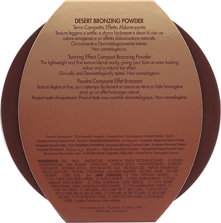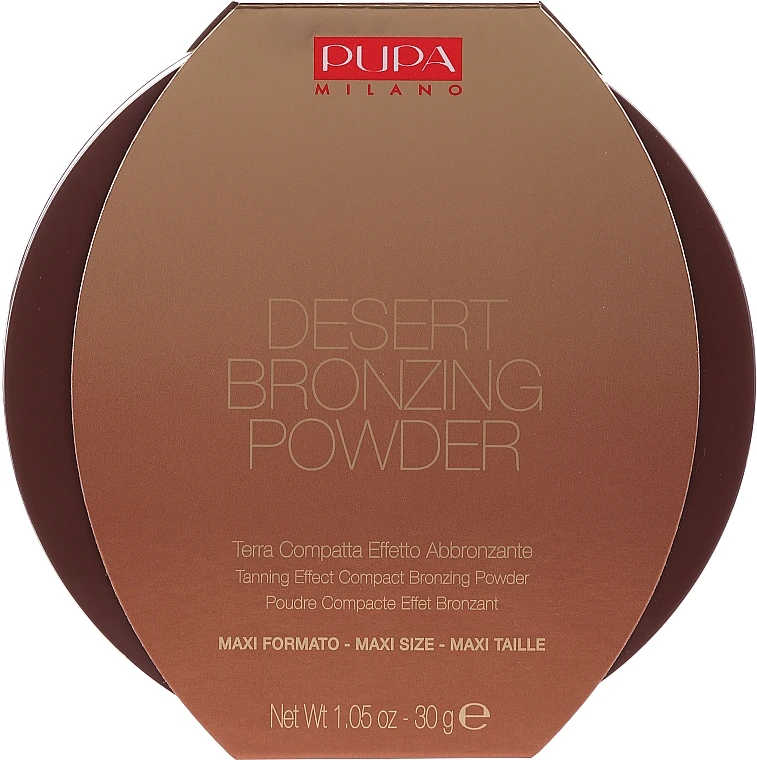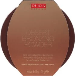 Draußen ist ein trüber Tag, die Wolken bedecken den Himmel mit einem dunklen Mantel, aber Sie sehnen sich nach Sonnenschein? Lieben Sie Ihre Haut mit den zarten Goldtönen und möchten Sie diesen strahlenden Anblick für immer behalten? Dann greifen Sie zum Pupa Desert Bronzing Powder und genießen Sie eine natürlich wirkende Bräune, wann immer Sie wollen! Das Produkt ist in sechs Farbtönen erhältlich – drei Perlglanz- und drei Matttöne. Die ultra-milde Formel reduziert das Allergierisiko, während die weiche, seidige Textur Ihr Gesicht weich und geschmeidig macht und ein elegantes, schimmerndes Finish verleiht. Lässt sich leicht auf der Haut verteilen, gleicht den Hautton aus und verschmilzt perfekt mit dem Teint, ohne künstlich zu maskieren. Vitamin E verlängert die Jugendlichkeit Ihres Teints, indem es die schädlichen Auswirkungen der freien Radikale neutralisiert.